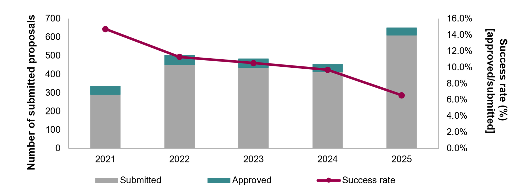 From the 611 applications, only 40 projects were selected for funding, resulting in a 6.5% success rate – an all-time low.  As can be seen in the figure below, the increase in submissions without a corresponding increase in funded projects indicates a rapidly intensifying competition landscape.
